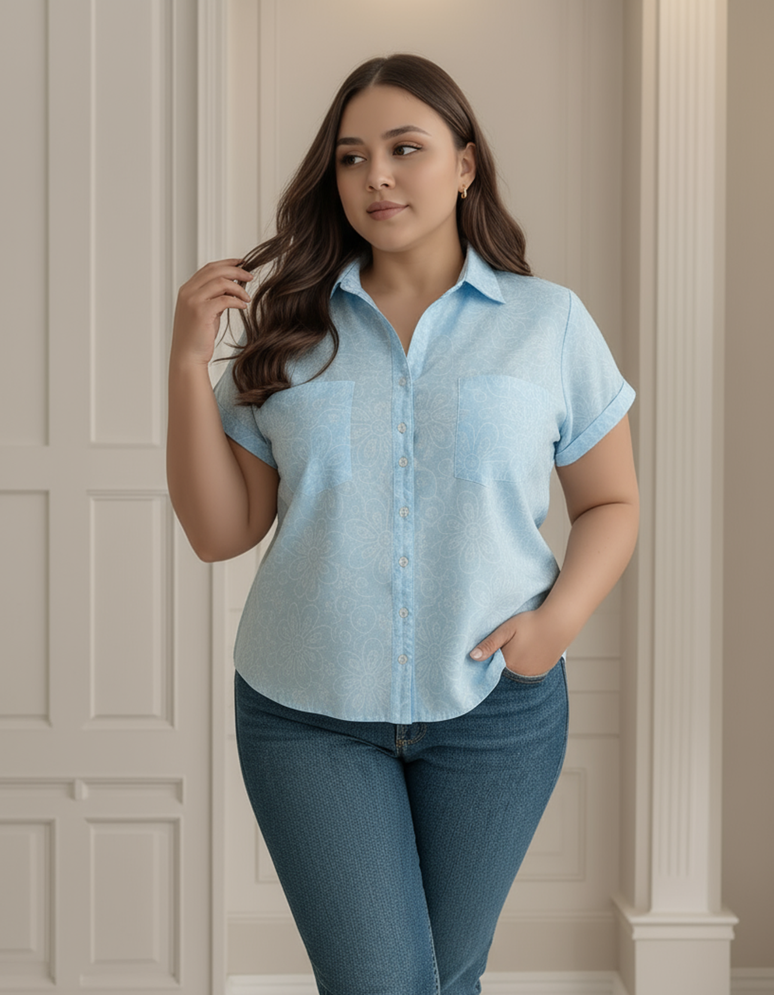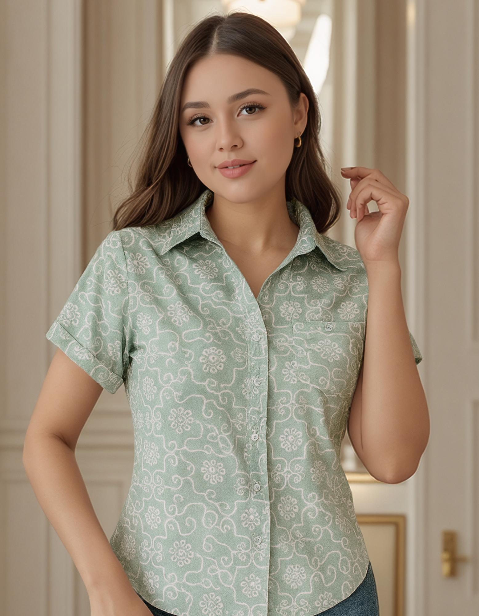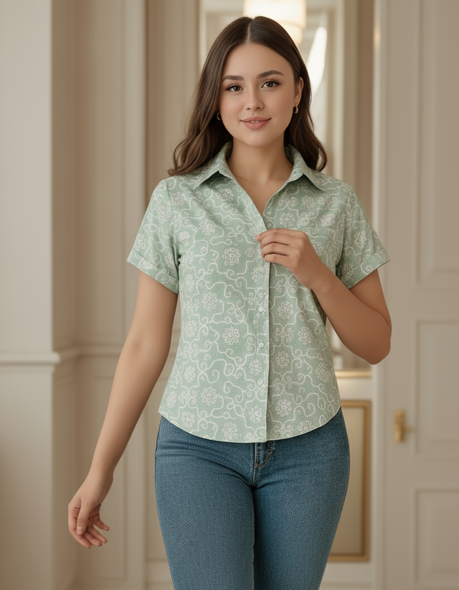 Blusa confeccionada en tela chalis suave y ligera, sin elasticidad. Su diseño incluye cuello camisero, botones frontales y manga corta. Con estampado delicado que aporta frescura y estilo. Ideal para climas cálidos y perfecta para looks casuales o semi-formales.
