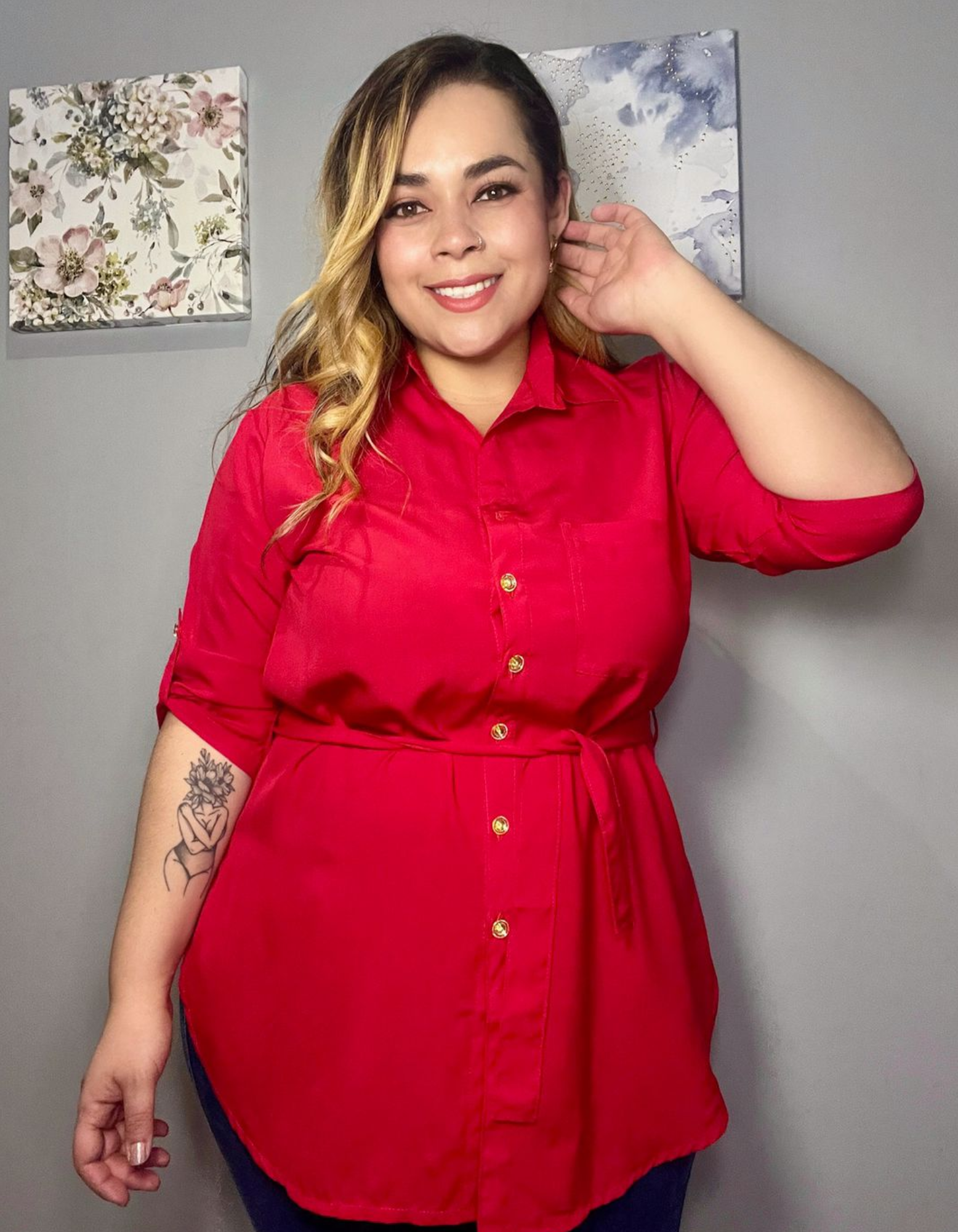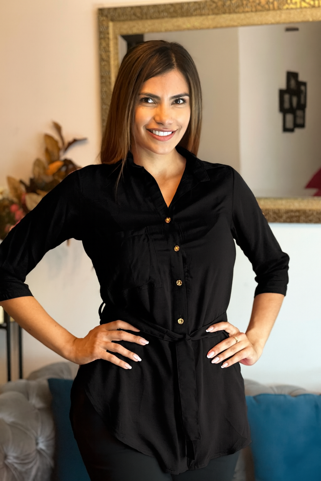 Blusa en tela fresca y ligera, con diseño largo tipo túnica que estiliza la figura. Incluye botones frontales y cinturón del mismo tono para ajustar a la cintura. Cuenta con manga 3/4 con opción de recoger. Ideal para un look cómodo, versátil y moderno, perfecta para usar con jeans o pantalones en ocasiones casuales o semi-formales.